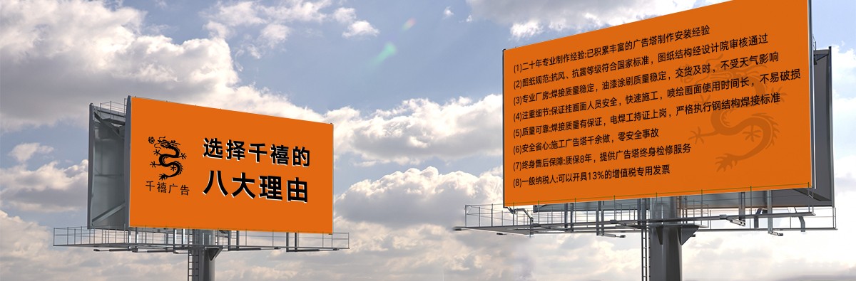 世紀(jì)之交,石家莊千禧廣告裝飾有限公司(下方簡稱千禧廣告公司或公司)自2000年10月10日創(chuàng)立伊始,即在燕趙大地落地生根,成長為國內(nèi)擁有23年施工經(jīng)驗(yàn)的實(shí)體型戶外廣告設(shè)施制作工廠。公司集新品研發(fā)、結(jié)構(gòu)設(shè)計(jì)、生產(chǎn)制作、施工建造于一體,現(xiàn)代化生產(chǎn)廠房為大中型高炮廣告牌(又稱高炮廣告塔、單立柱廣告牌、單立柱廣告塔、擎天柱廣告塔、擎天柱廣告牌)、龍門架、三面翻鋼結(jié)構(gòu)、LED廣告屏鋼結(jié)構(gòu)等的精益生產(chǎn)、高效流水化作業(yè),產(chǎn)品交工質(zhì)量過硬,公司擁有現(xiàn)代化生產(chǎn)車間,配備了不可或缺的硬件裝備。